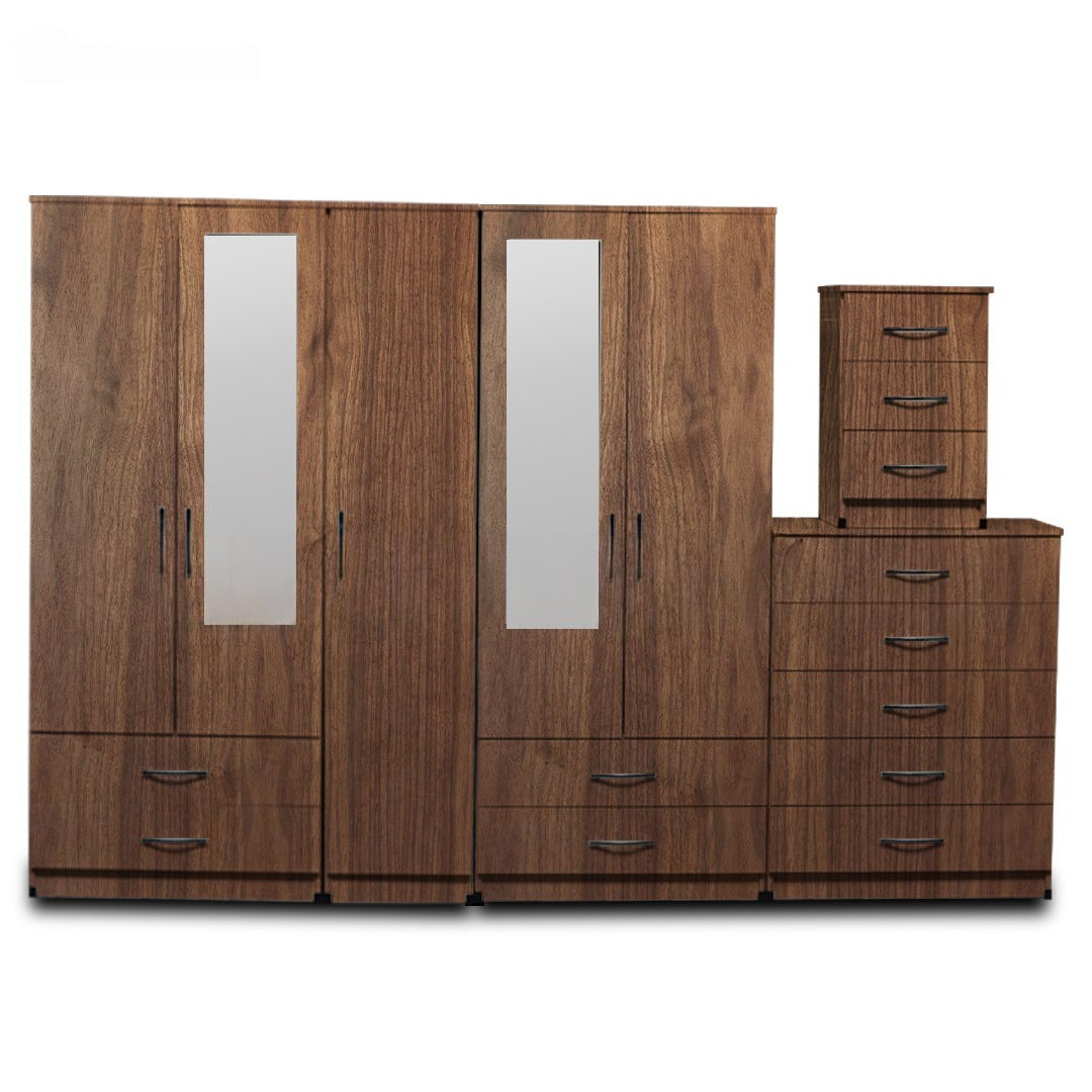 With five spacious doors, a matching chest of drawers, and bedside tables, this set ensures your space stays stylish and well-organized.